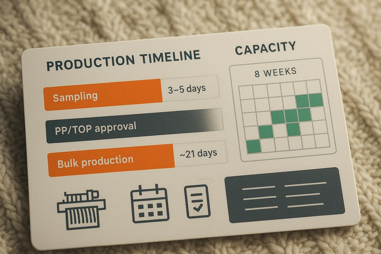 Bulk lead time policy target is approximately 21 calendar days ex‑factory, counted from PP/TOP approval when production yarn, trims, and labeling are on hand. The critical path typically runs: yarn booking and lab dips (if dyed to order), PP approval, production start with inline quality checks, and pre‑shipment inspection once goods are ≥80% finished and packed. For context on standard inspections and timing conventions, see the QIMA descriptions of apparel inline and pre‑shipment inspections and their sampling logic in the AQL standard in the QIMA overviews: apparel inspection scope and timing and pre‑shipment inspections at ~80% completion.